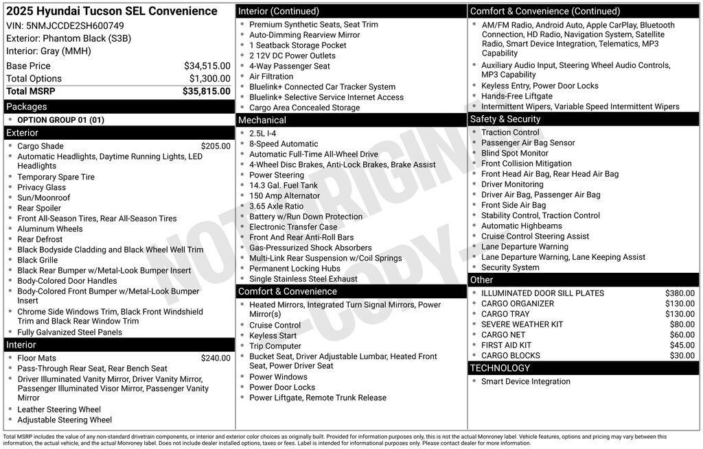 Phantom Black 2025 Hyundai Tucson SEL Convenience AWD 8-Speed Automatic with SHIFTRONIC 2.5L I4 DGI DOHC 16V LEV3-SULEV30 187hp AWD.